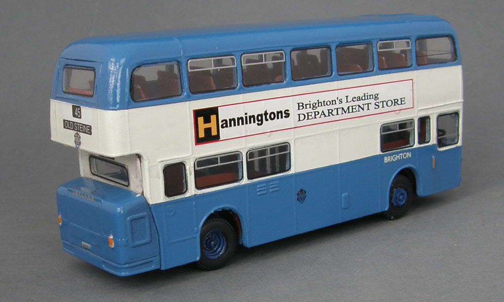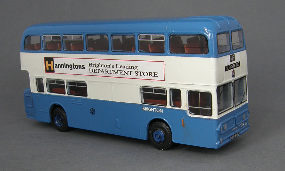 LEYLAND PDR1/1 ATLANTEAN DOUBLE DECK, WILLOWBROOK FULL HEIGHT (14’ 5”) DUAL DOOR BODY – BRIGHTON CORPORATION Willowbrook of Loughborough was a small scale bodybuilder, a subsidiary of Duple from 1958 and largely building for the BET Group. It entered the rear engined double deck market somewhat notoriously in 1964 by bodying 22 Leyland low height PDR1/2 Atlanteans in Daimler’s home territory for Coventry Corporation but followed up the next year with 22 nearly identical bodies on Daimler Fleetline chassis. The kit is based on the ten PDR1/1 Atlanteans delivered to Brighton Corporation in 1970/71. These were Brighton’s first rear engined double deckers and had dual doors and a central staircase. A further ten buses were delivered in 1973 on the longer AN68 Atlantean chassis, however these had a very different style of dash and windscreen.
